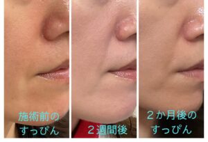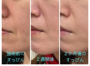 統一されてなくて申し訳ないのですが、施術前と2か月後の写真がすっぴん(日焼け止めもなし)で、真ん中の2週間後の写真は日焼け止めを塗っています。